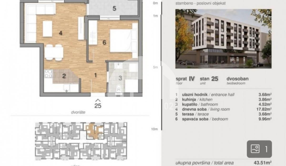 Prodaje se moderan dvosoban stan u izgradnji, površine 42,21 m², smešten na četvrtom spratu kvalitetne novogradnje renomiranog i pouzdanog investitora. Planirani rok završetka je kraj godine – idealna prilika da na vreme obezbedite nekretninu po povoljnijim uslovima.